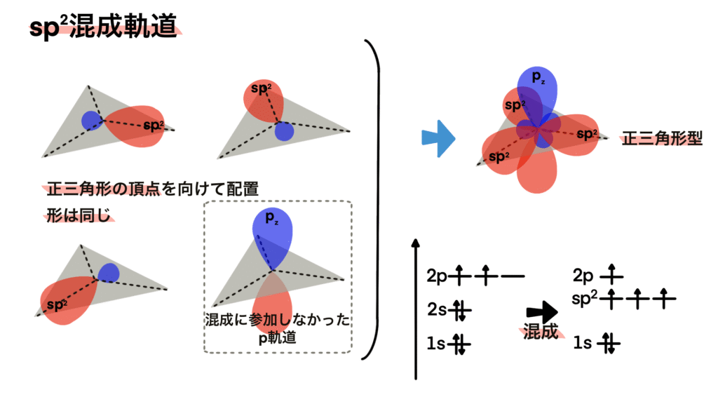 以下の原子軌道の線形結合で表され、結果として正三角形の頂点へ向けた軌道ができます。