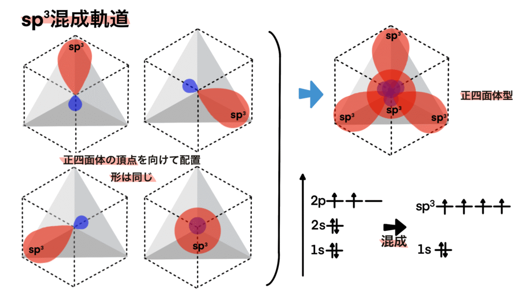 以下の原子軌道の線形結合で表され、結果として正四面体の頂点へ向けた軌道ができます。
