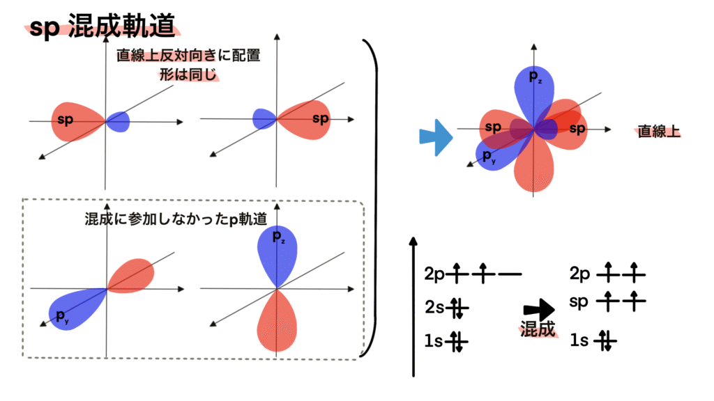 以下の原子軌道の線形結合で表され、結果として直線に対向する軌道ができます。