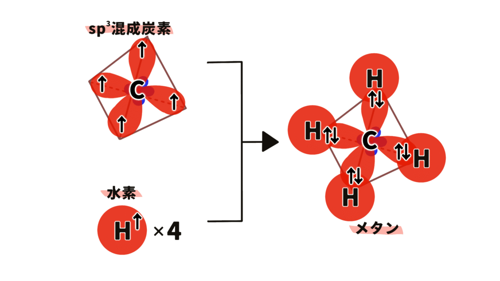 また、sp3混成軌道をとることで正四面体となるため、実際のメタンの分子構造と整合性が取れます。